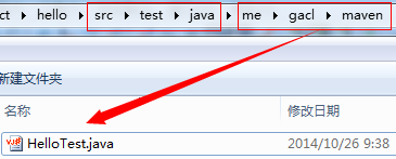 4、在/src/test/java/me/gacl/maven目录下新建测试文件HelloTest.java