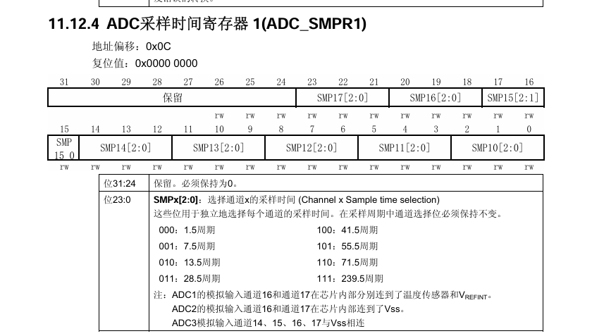 - 采样时间:由SMPx[2:0]位配置,可选范围为1.5~239.5个ADC时钟周期