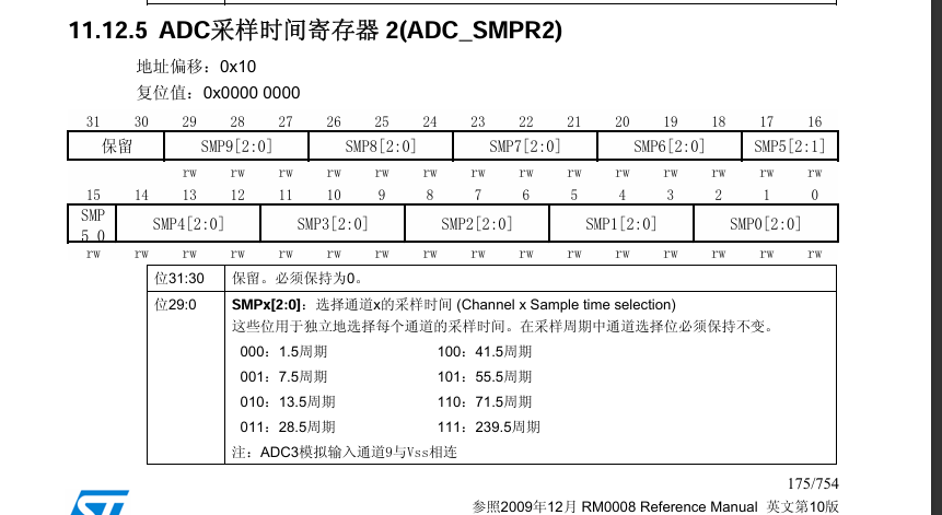 ADC->SMPR2 |= (0b000 << 0); // SMP0[2:0] = 000