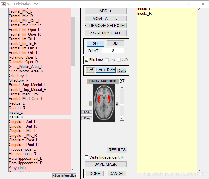 选择Human atlas后,点击aal(AAL是一个脑区模板),就会出来所有脑区的名称,比如我想要脑岛的模板,就点击nsula_R和insula_L :