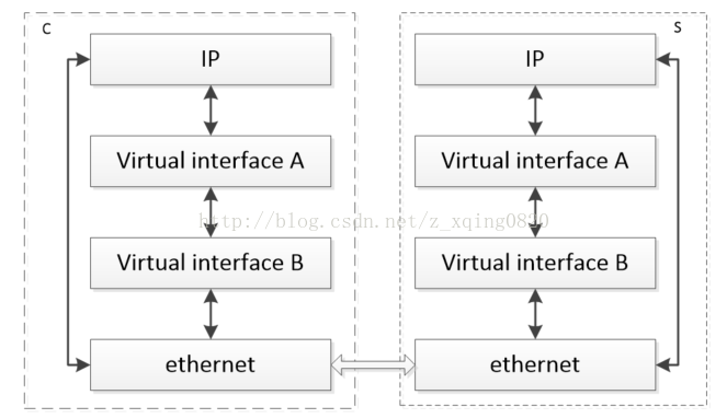 在上图中c侧Virtual interface A 的IP地址为192.168.2.2/24,该侧另有一个以太口eth0 ip地址为192.168.1.2/24;s侧Virtual interface A的IP地址为192.168.2.6/24,同时该侧也有一个以太口eth1 ip地址为192.168.1.6/24。Virtual interface B层定义协议号为0x9090,且该实现是将Virtual interface A传递的数据送往eth0,同时将从eth0收到的数据递交到Virtual interface A。s 侧同理。