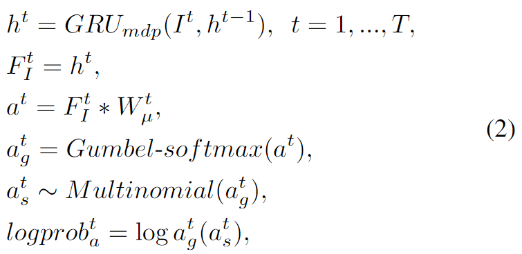 其中,It 是 GCN 推理后的第 t 个图像特征。GRUmdp 是用于将注意力权重生成问题建模为 MDP 的门控循环单元(GRU)。W t μ∈ Rs×n 是需要学习的权重。S 是特征向量的大小。Atg 是经过 Gumbel-sof tmax 激活后每个动作的概率。