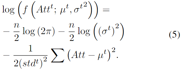其中 Attt 为从该正态分布中采样的注意力权重。该正态分布的对数概率表示为: