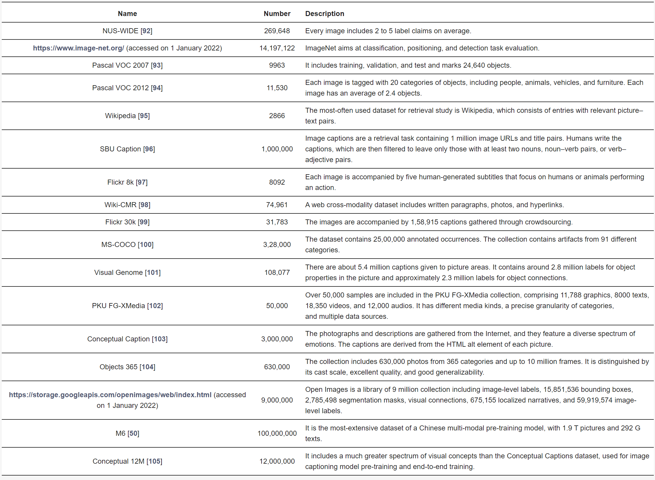 基准数据集通常用于评估跨模态检索的性能。表4显示了对经典跨模态数据集的分析和解释,包括数据集的名称、图像和文本的数量以及描述。