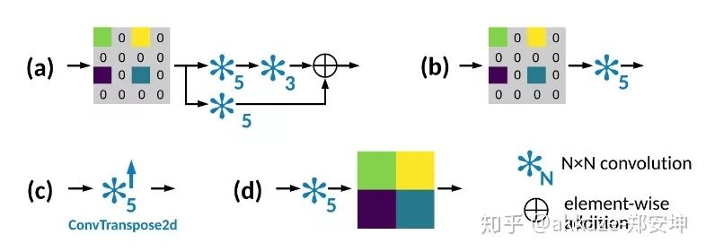 几种不同的上采样:(a)先用upsamling或者unpooling然后接两个conv,并使用跳转连接,(b)使用upsampling或者unpooling然后接普通的conv,(c)接转置卷积(d)卷积后使用upsampling或者unpooling