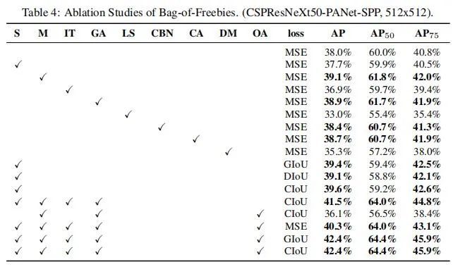 在检测器训练时,我们验证了最先进Bag-of Freebies and Bag-of-Specials目标检测方法的影响。