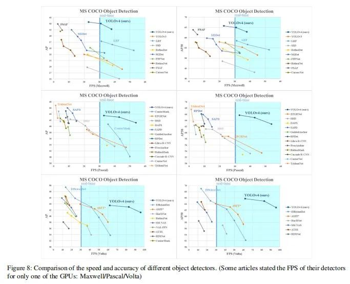 与其他的检测器相比较,YOLOv4在速度和精度上都优于最快最精确的检测器。