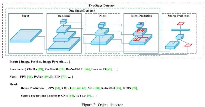 头部一半分为一阶段目标检测器和二阶段目标检测器。最具代表性的二阶段目标检测器R-CNN系列,包括fast R-CNN,faster R-CNN ,R-FCN [9],Libra R-CNN。也可以使得二阶段目标检测器成为anchor-free目标检测器,例如RepPoints。至于一阶段目标检测器,最具代表性的网络包括YOLO、SSD、RetinaNet。