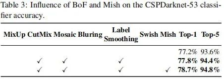 Bag of Specials (BoS) for backbone: Mish activation, Cross-stage partial connections (CSP), Multi-input weighted residual connections (MiWRC)
