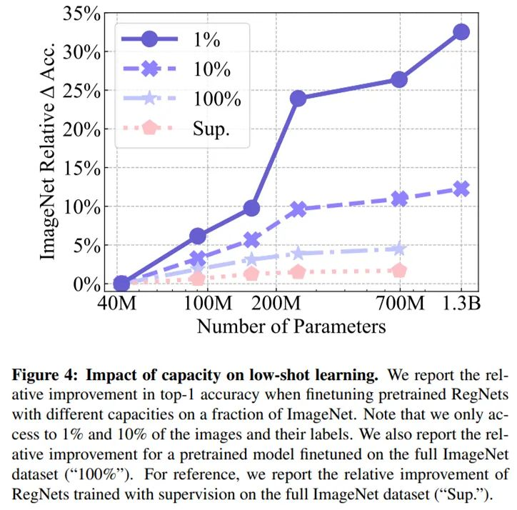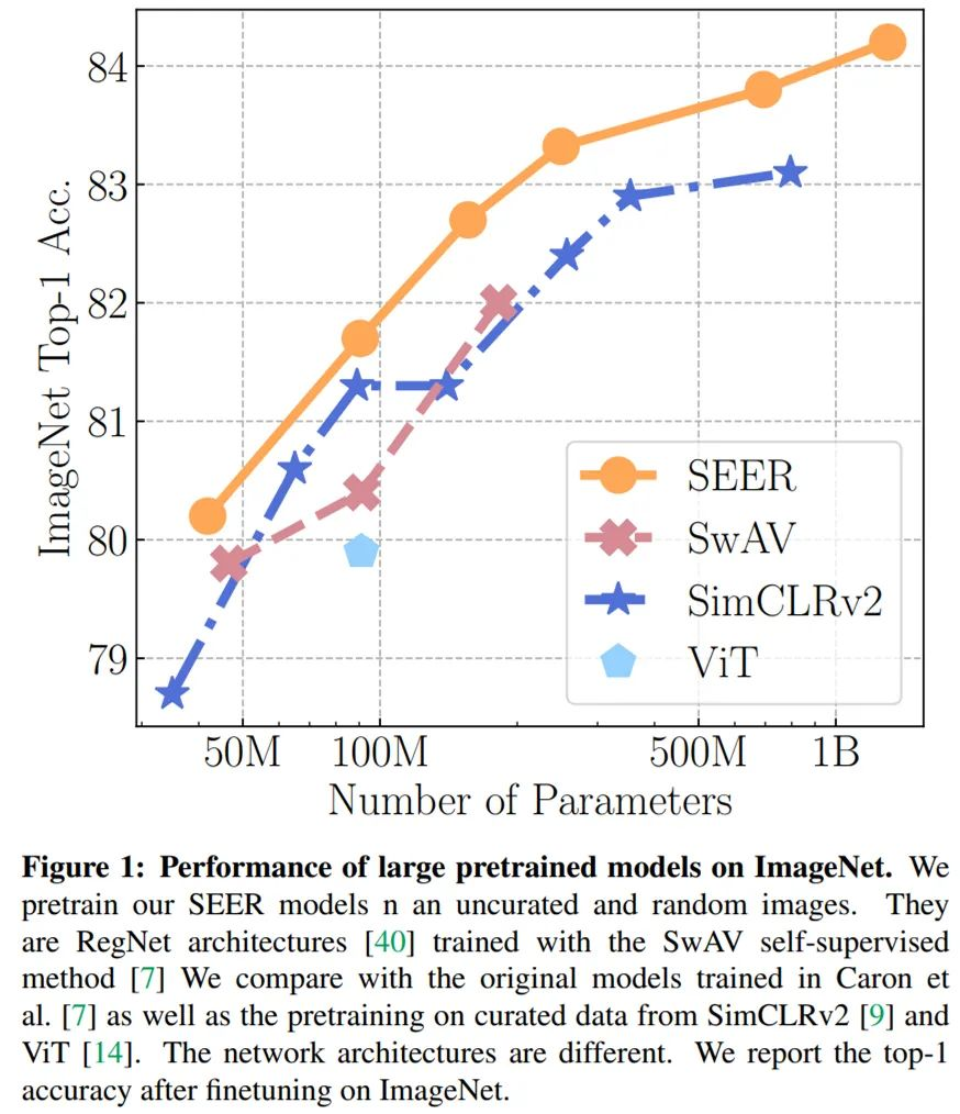 ImageNet 数据集上,SEER 与 SwAV、SimCLRv2、ViT 等大型预训练模型的性能曲线。