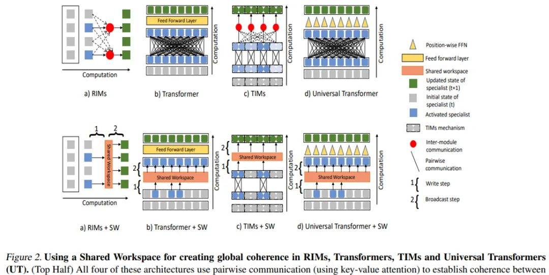 使用共享工作区在 RIM (Recurrent Independent Mechamism)、Transformer 和 Universal Transformer (UT) 中创建全局一致性。