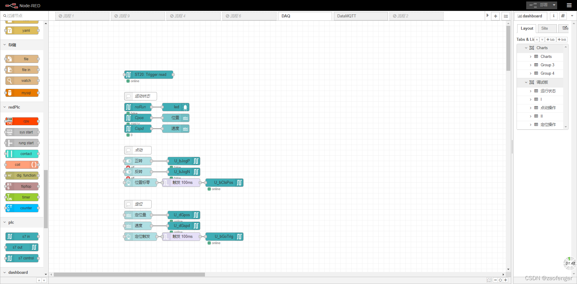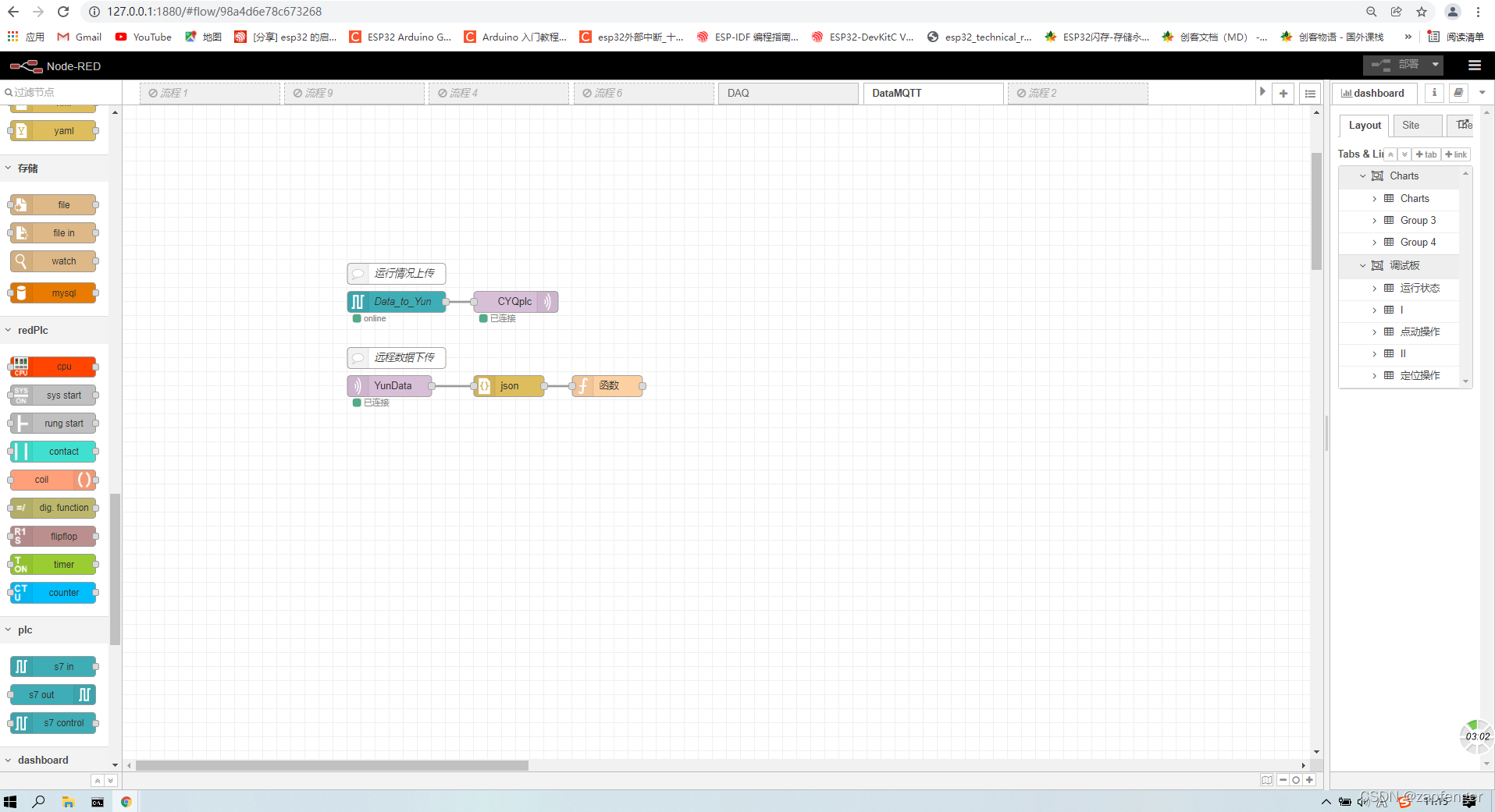 PC通过网线采集S7-200SMART数据,通过PC端部署的node-red,与云服务器部署的node-red通过MQTT通信,并将数据在本地或外网界面显示。