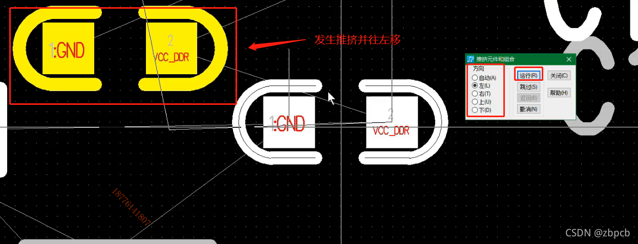 也可以通过选择“提示”功能进行元件推挤,选择自己想要的方向进行推挤。以发生推挤向左移动为例,移动器件后,弹出对话框,选择“左”并点击“运行”,便能看到变化。操作如下图所示: