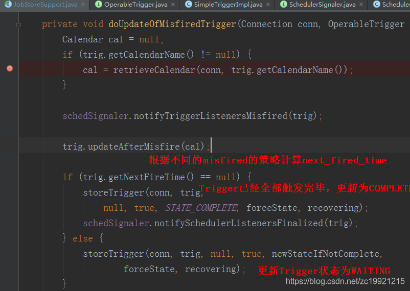 核心是updateAfterMisfire()方法,内部根据程序选取的Misfire策略设置Trigger的setNextFireTime(cal)进行恢复,本文接下来会说明一些Misfire策略。