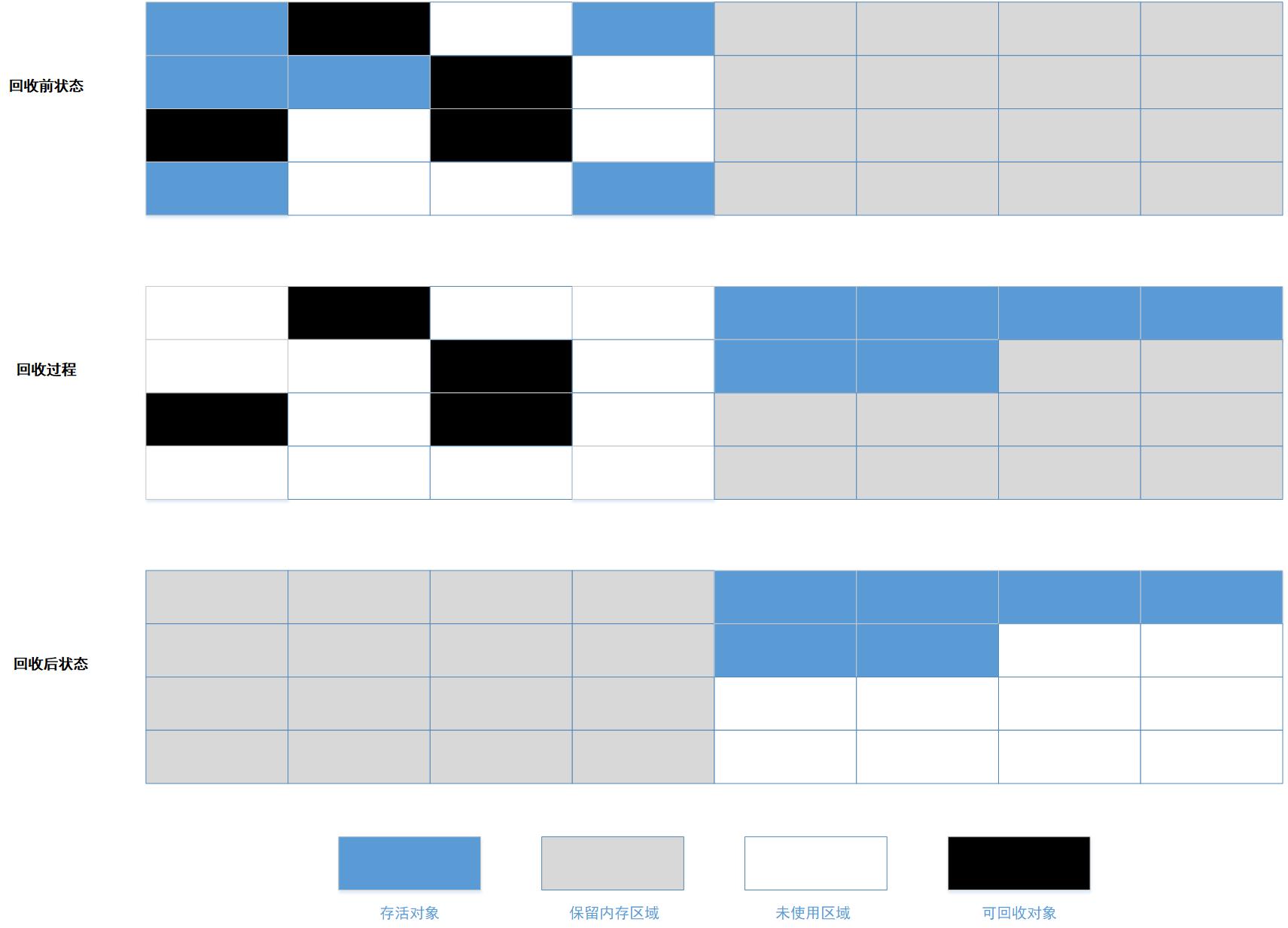 JVM老年代使用的是标记-整理算法。标记-整理算法是核心是首先标记需要回收的对象,然后将存活的对象都向一端移动然后清除该端边界之外的内存。过程如下图: