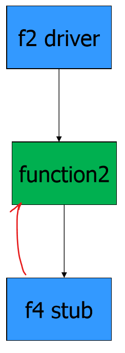 如果需要测试这些存在dependency的Unit则需要对其进行一定的处理。例如如果需要测试f2那么我们就可以弄一个可以替代f4的Unit来给f2传递其需要的数据,这个substitute称为Stubs。当然这个stubs不一定要和f4一模一样可能是f4的精简版,另外在测试f2之前我们还需要保证f4的正确性,即要先测试f4。测试的结构图如下,其中f2 driver中包含了很多的test cases用于这个测试。这个Driver也称为mock,Stubs也称为mock ups.
