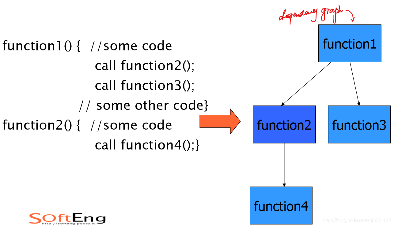 在工程中,每个Unit都是一个独立的个体,但是在某些Unit之间会存在一些dependency导致这些Unit在测试时需要进行处理才能从整个系统中给分离出来单独测试。其中Unit在不同类语言中表示的东西也不同,比如在procedual languages(面向过程的语言)中其表现为function,而在oo language(面向对象的语言)中表现为类以及类中的methods。要知道是否在各个unit之间存在有dependency,我们需要画出dependency graph,如下右边所示:其中f1的运行就依赖于f2和f3运行的结果,同样的f2运行依赖于f4的运行结果。