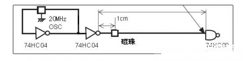 我们将两个磁珠分别放在如下的 20MHz 的信号线上,看看对信号输出会产生什么样的影响。