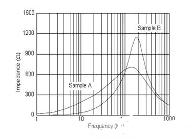 磁珠 A 和磁珠 B 的阻抗峰值都在 100MHz 和 200MHz 之间,但磁珠 A 阻抗频率曲线比较平坦,磁珠 B 则比较陡峭。