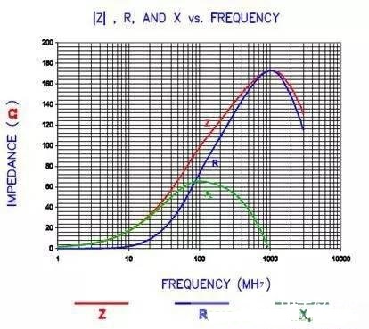 从等效电路中可以看到,当频率低于 fL(LC 谐振频率)时,磁珠呈现电感特性;当频率等于 fL 时,磁珠是一个纯电阻,此时磁珠的阻抗(impedance)最大;当频率高于谐振频率点 fL 时,磁珠则呈现电容特性。EMI 选用磁珠的原则就是磁珠的阻抗在 EMI 噪声频率处最大。比如如果 EMI 噪声的最大值在 200MHz,那你选择的时候就要看磁珠的特性曲线,其阻抗的最大值应该在 200MHz 左右。下图是一个磁珠的实际的特性曲线图。大家可以看到这个磁珠的峰值点出现在 1GHz 左右。在峰点时,阻抗(Z)曲线的值与电阻(R)的相等。也就是说这个磁珠在 1GHz 时,是个纯电阻,而且阻抗值最大。
