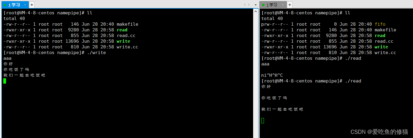 如上图所示,左右两边是同一台机器同一个路径下,我们首先在左边创建了匿名管道,然后我们就成功创造出fifo的特殊文件,然后我们用echo将内容重定向到命名管道中,然后左边cat进行读取,成功读取,echo和cat两个进程成功通信