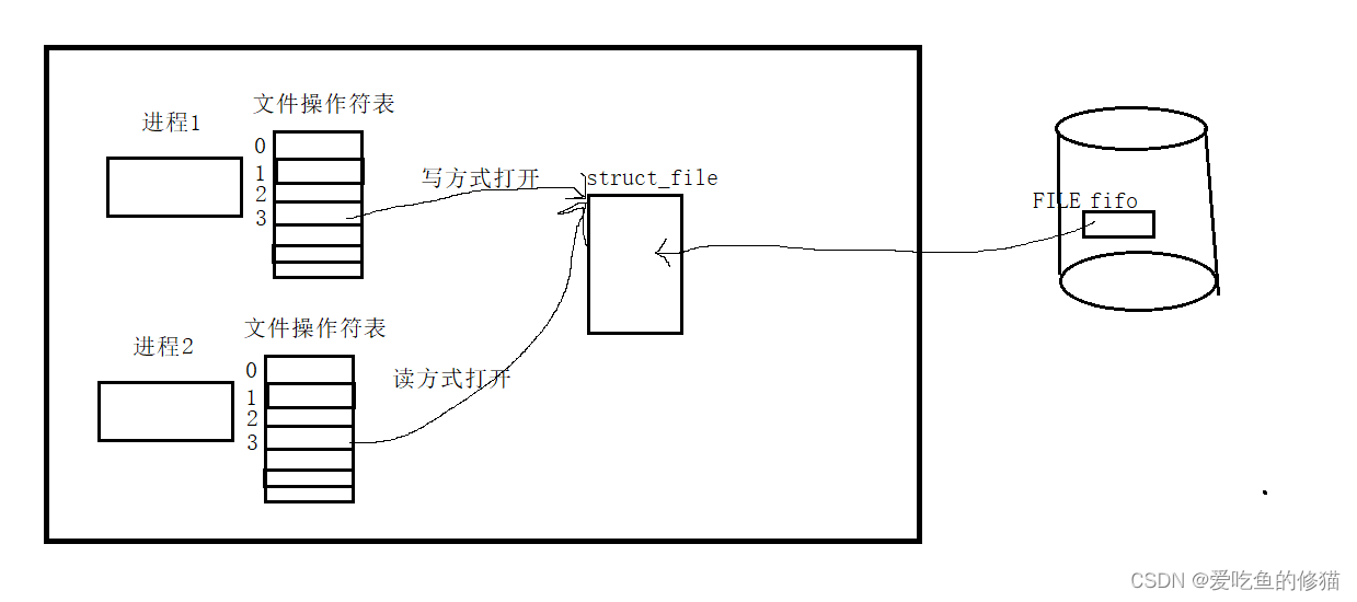 如上图,进程1以写的方式打开命名管道fifo,然后进程2以读的方式打开命名管道fifo,经过os的优化,进程2会直接用已经被进程1打开的fifo,这样进程1和进程2就看到了同一个文件,就可以通过这个文件进行通信,然后进程1写入内容,进程2进行读取,这样两个进程就通过命名管道fifo实现了通信