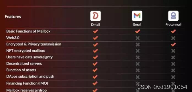 上图比较了 Gmail 与两个区块链邮箱的功能。在 web3 时代,区块链邮箱可以做得更多。这其实说明了web3时代邮箱的功能转型,尤其是在Dmail的设计上,将从单一的信息交互功能,转变为一个包含信息、资产和多种DApp应用的复合平台,与Dfinity生态一起开发。邮箱只是其基本功能之一,但更多的用户可能会基于隐私和安全来体验其各种资产和DApp应用。