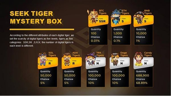 盲盒总共分为五个稀有等级分别为:SSR、SR、S、R、N。SeekTiger的NFT数字虎主要根据当下主流加密资产所命名,并且包含BTC虎、ETH虎、BNB虎、SOL虎、ADA虎、TRX虎、Doge虎以及Candy虎,不同种类的NFT虎盲盒数量以及开出概率如下: