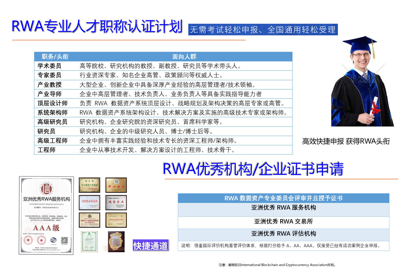 国际区块链与数字货币协会(IBCA)成立RWA数据资产专业委员会,这将成为在中国RWA全范围的高纬度、高格局、高档次、国际视野的权威指引。IBCA还将开展行业评级和认证,RWA领域涌现出了一批优秀的个人和企业,IBCA将从众多申请者中进行评选,对于个人,按照个人会员的综合能力给予学术委员、专家委员、产业教授、产业导师、高级研究员、RWA研究员、高级工程师、RWA工程师等证书,对于企业按综合能力给予RWA优秀服务机构、RWA高级服务机构、RWA认证服务机构等资质。