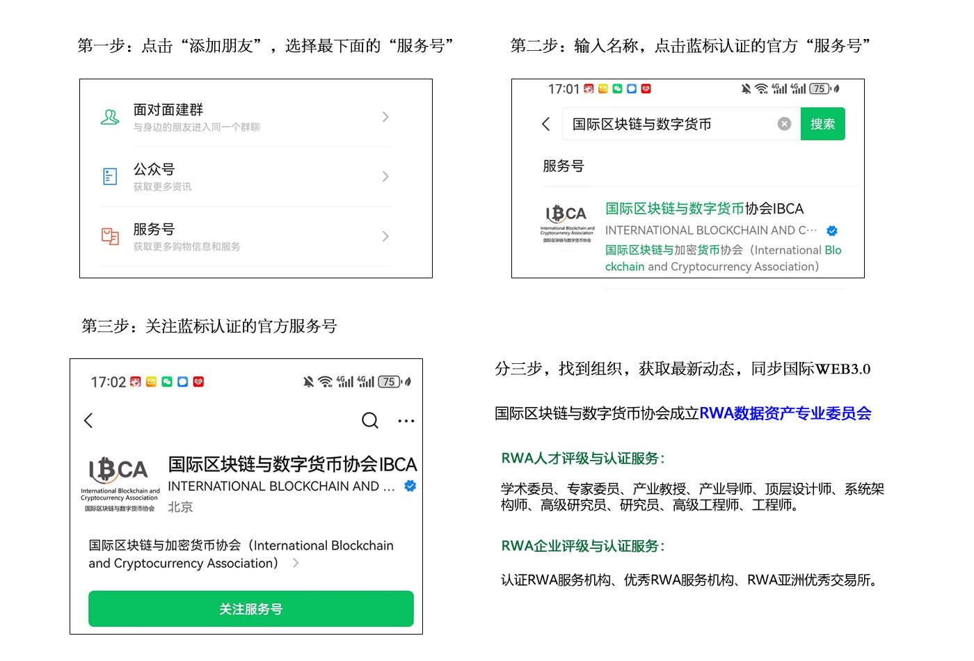 IBCA已经开通了官方的微信服务号,微信界面点击“添加朋友”,选择最下面的“服务号”,搜到带蓝标认证的“国际区块链与数字货币协会IBCA”即为中国区业务平台。IBCA是由全球区块链平台企业、区块链服务机构、金融服务机构、物流服务机构、区块链NGO组织、具备条件转型升级的传统企业、相关科研院所、高校及有关专家学者等自愿参加的国际性区块链行业组织。