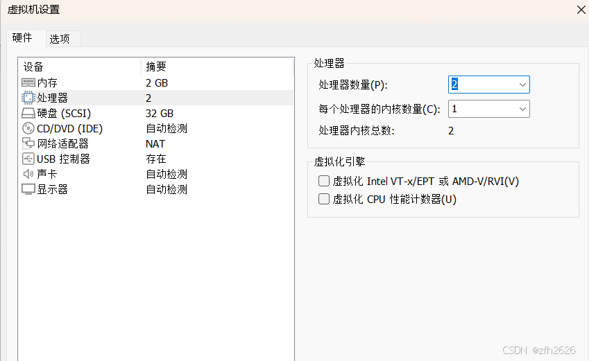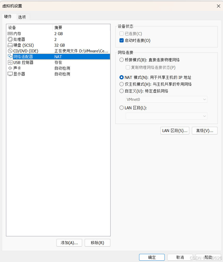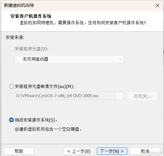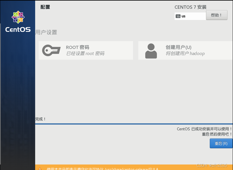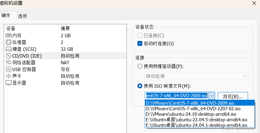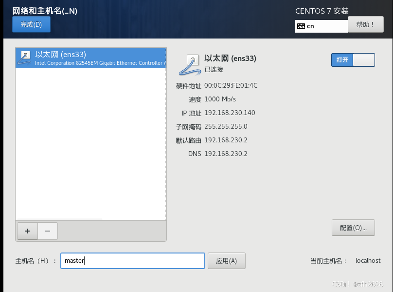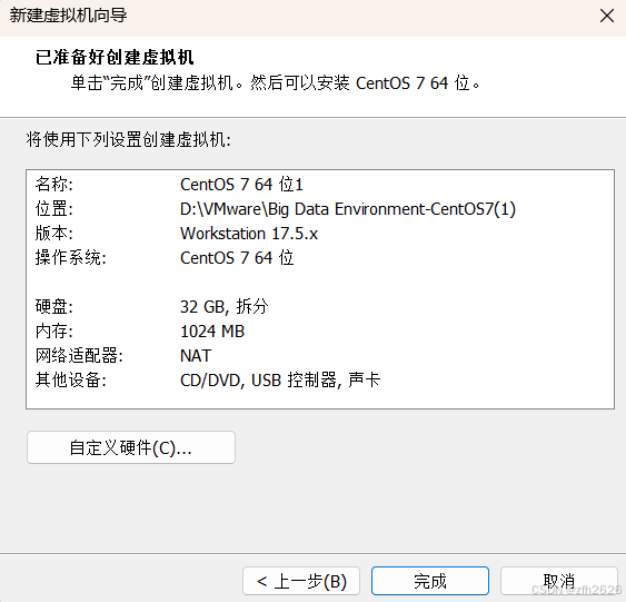 1.打开VMware,点击创建新的虚拟机 2.选择典型(推荐),点击下一步 3.选择稍后安装系统,点击下一步,系统镜像等到框架创建完成之后再安装 4.选项默认的就可以,直接点击下一步 5.虚拟机名称中名字填写无限制,可以自己更改,点击位置后面的浏览选项,可以选择虚拟机安装的位置,我这里安装在了D盘,你可以自己选择安装的位置 6.此处磁盘大小可以根据需求自己选择,我这里增加到了32.0,选择完之后点击下一步 7.点击完成,虚拟机的基本框架完成创建 8.右键点击上方刚建立完的虚拟机图标,点击出现的设置选项 9.此处内存可以根据自己电脑情况自己添加(添加后的内存必须是4的倍数) 10.处理器数量和内核数量根据自己的电脑配置和场景需求自己更改配置,我这里增加了一个处理器数量 11.CD/DVD(IDE)处连接选择使用ISO映像文件,点击浏览,查找下载好的镜像文件,我这里下载的是阿里云镜像站的CentOS-7-x86_64-DVD-2009.iso镜像文件 12.网络适配器选择NAT模式 13.剩下的设置不用更改,直接点击页面下方的确认,然后点击开启此虚拟机 14.点击页面,然后直接回车 15.等待开启完成 16.开机完成后会出现此页面,页面默认的是英文,新手可以下拉到最底部找到中文,然后点击继续 17.此处选择上海时区,点击完成 18.软件选择的基本环境可以使用默认的最小安装,也可以选择下面的GNOME桌面,选择好后点击完成 19.此处若没有特定需求,默认的就可以,点击完成 20.打开页面上的以太网开关,下面的主机名可以自行更改,此处我将用户名改为了master,然后点击完成 21.其余选项无需更改,点击开始安装 22.点击root密码选项,可以在其中设置root用户的密码,点击完成,root密码设置完成,然后点击创建用户,输入用户名和密码,点击完成后普通用户创建完成,最后等待软件包安装完成 23.完成后点击重启 24.点击未接受许可证旁的选项,勾选我同意许可协议,点击完成,然后点击完成配置 25.输入密码,进入桌面,一直点击前进,跳过系统引导,系统创建完成