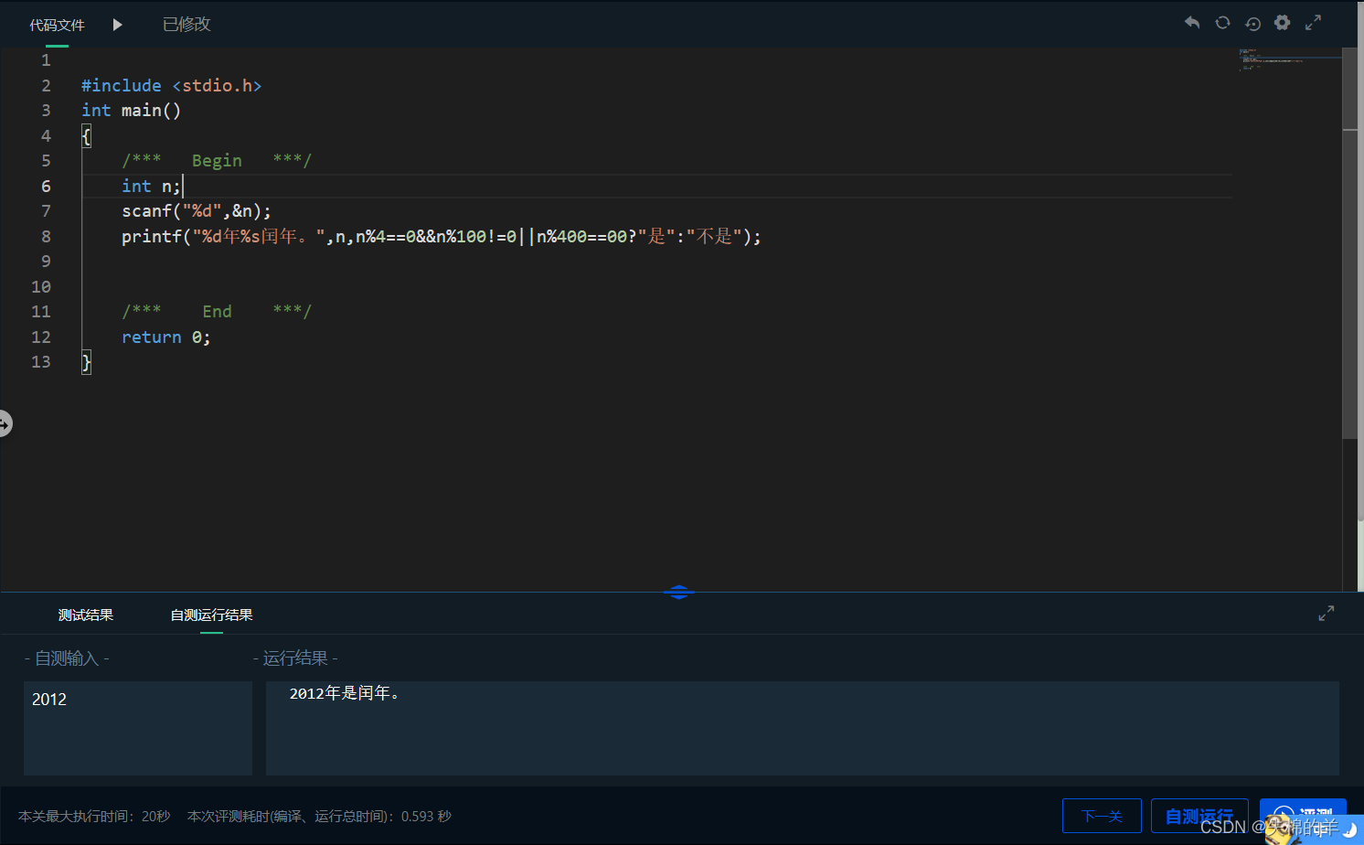 根据提示,在右侧编辑器Begin-End区域内补充代码,读入年号之后,判断并输出该年是不是闰年的信息。
