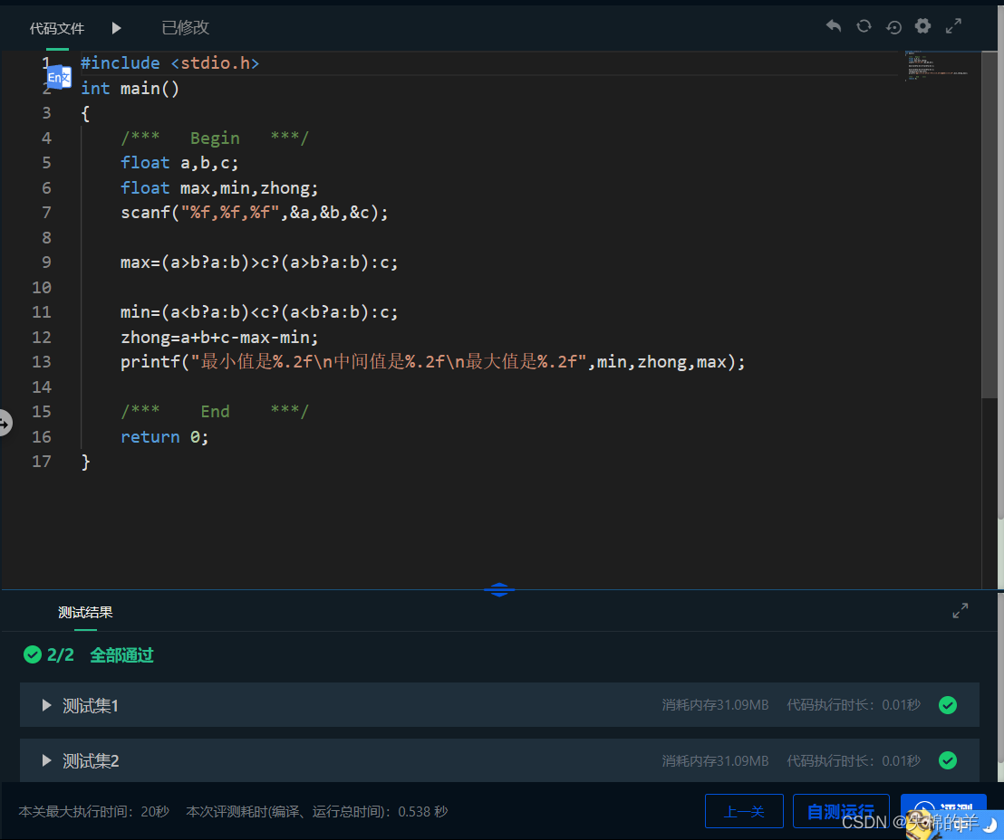 为了完成本关任务,你需要掌握: 1.如何用条件表达式计算出3个数中的最大值和最小值。 2.实型数据的输入,以及按照指定格式输出的方法。
