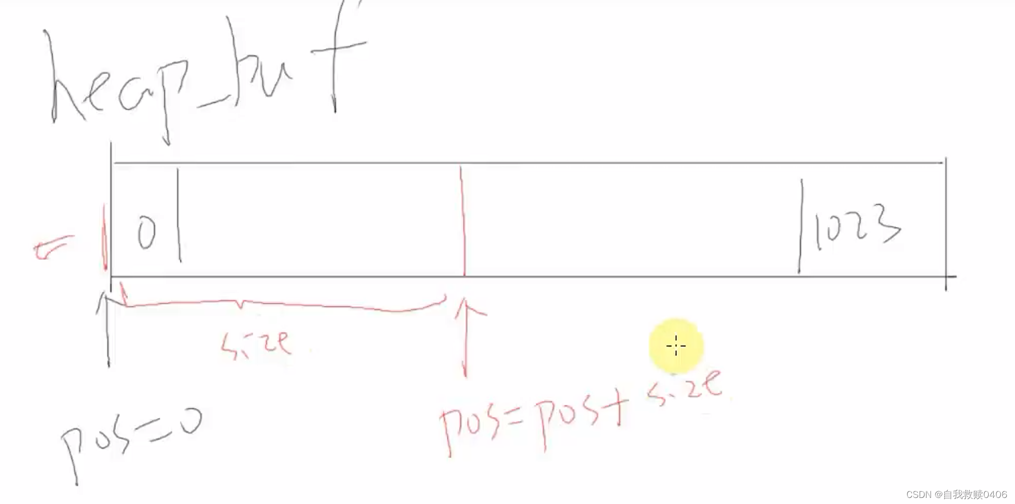 我们这个函数比较简单,它做什么事情呢?它做的事情就是在这个buf中来分配一个小块的内存,这是我们的heap_buf,它的下标是从0到1023,一开始这个pos等于0,我们想来分配size大小的空间,怎么分配呢?我把这个首地址返回去,然后让pos等于原来的位置加上size