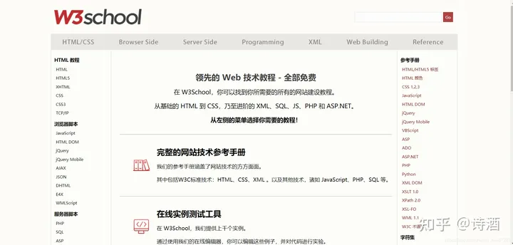 全球最大的中文 Web 技术教程。在W3School,你可以找到你所需要的所有的网站建设教程。从基础的 HTML 到 CSS,乃至进阶的 XML、SQL、JS、PHP 和 ASP.NET。