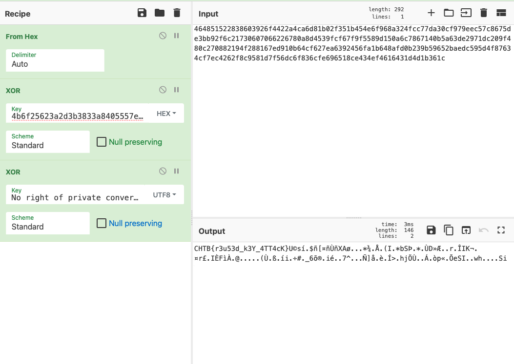 Crypto日记之利用CyberChef解png图片xor难题 今天晚上在刷题时发现了两道png图片加密的题目,都是xor,发现用CyberChef都能秒出,下面把解题过程整理下。第一题:攻防世界Crypto sleeping-guard题目来源: csaw-ctf-2016-quals题目描述:只有真正的hacker才能看到这张图片。(据说原题是有个py的代码,包含key的长度。)题目场景给了ip和端口,直接用nc连接发现一长串编码,这么长串的编码,先from base64一波:output是一段乱码,不过好像看到了RKEAey连续的字符,就像