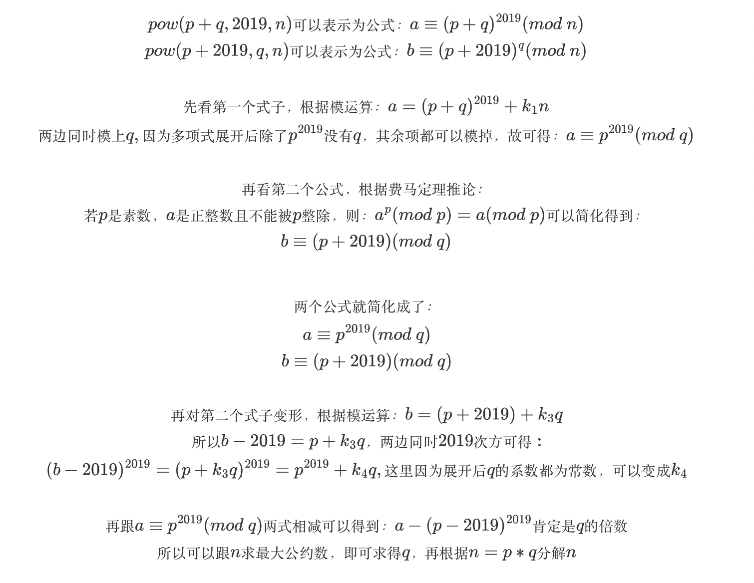 CTF-RSA 数论解题记一:2019-AceBear-babyRSA 前言最近一直跟着师傅们打比赛,学到了不少东西。看了看近期的几场比赛,虽然RSA的题越来越少了,但每场比赛都有,正好最近老遇见考LaXeT公式的题目,感觉公式写出来还挺好看,所以想试着利用LaXeT公式来写一下RSA类题目的推导过程,一方面提高下自己的基础数论水平,另外也磨练一下编写LaXeT公式的能力。借助网上一些RSA的题目,将具体的数论推导过程记录一来,可能有些基础,大佬请绕道。2019-AceBear Security Contest-babyRSA题目:from Crypto.Ut