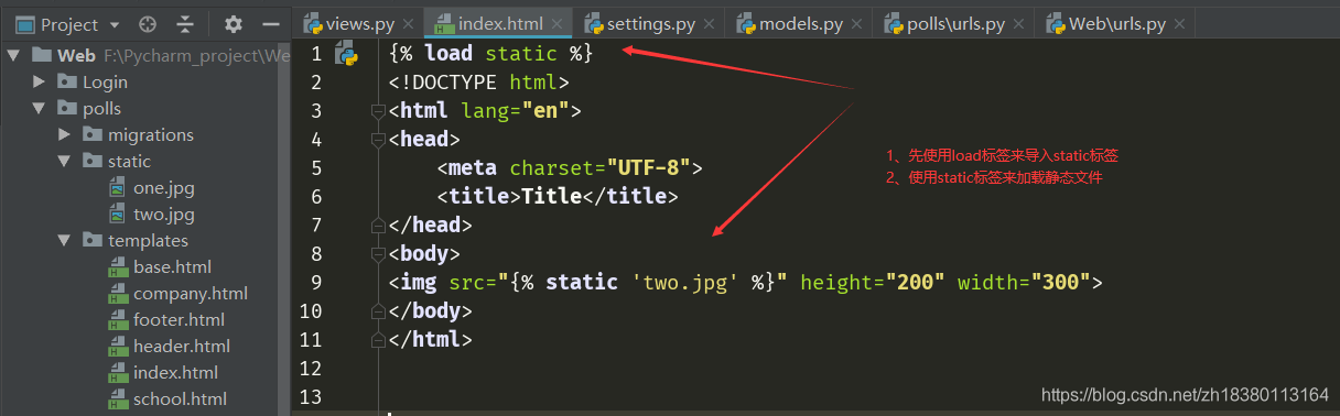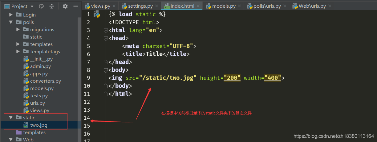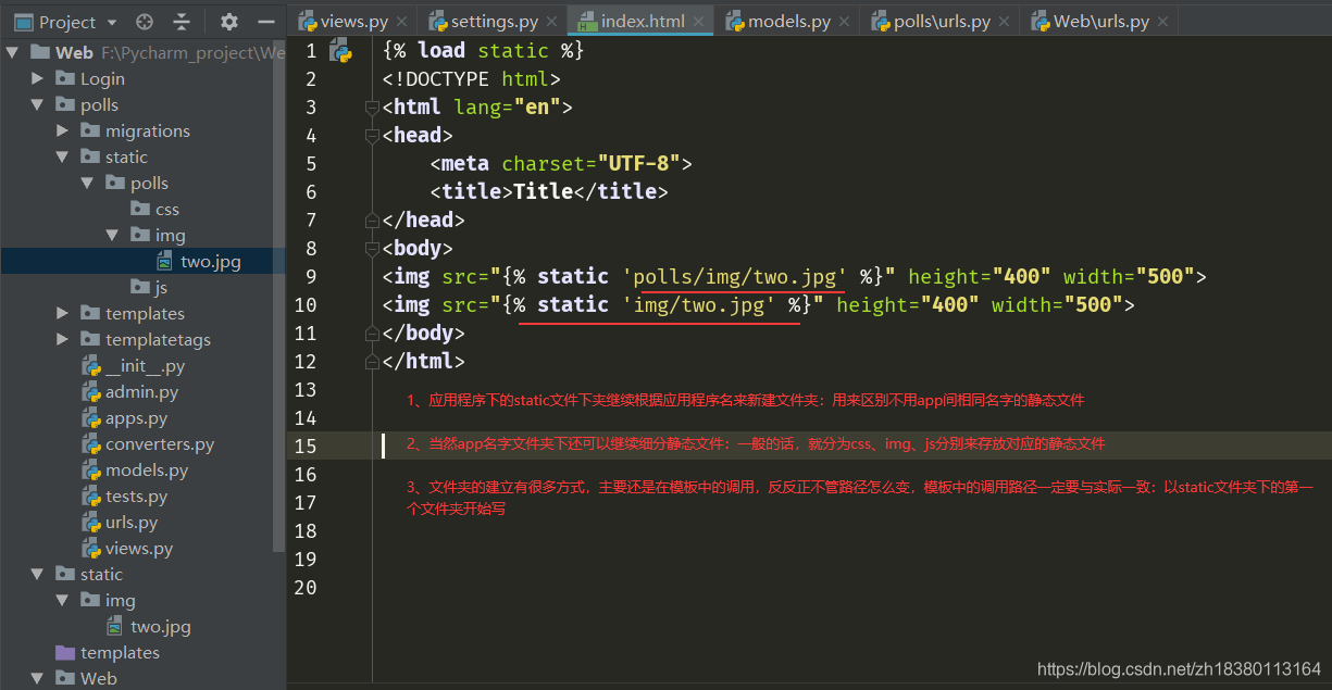 ⑵根目录或应用程序APP下的static文件夹下还有文件夹:那就需要加上中间的文件夹路径参数了(从static文件夹下第一层文件夹开始写),如"{% static 'polls/img/two.jpg' %}"