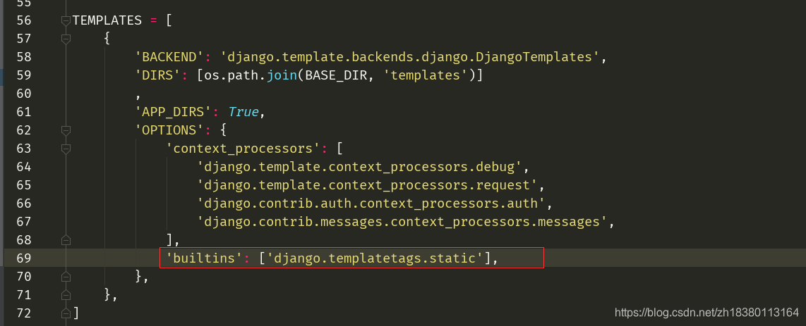2、如果不想每次在模板中加载静态文件都使用load标签来加载static标签的话,那么可以在setting.py中的TEMPLATES/OPTIONS下添加'builtins':['django.templatetags.static'],这样以后在模版中就可以直接使用static标签,而不用手动的load了