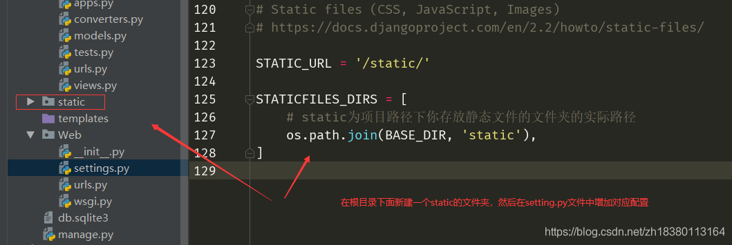 4、注意:如果static文件夹放在根目录下面,那么想要模板能正常找到对应的静态文件的话,就还需要单独设置下:在setting.py文件中增加静态文件的配置信息:根目录下的static文件夹一般存放的是项目公用的静态文件