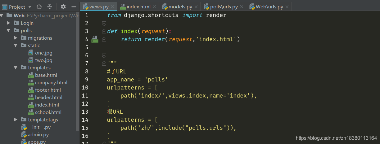 2、根目录或应用程序APP下的templates文件夹下还有文件夹:那在调用模板HTML文件时,必须从templates文件夹下的文件夹开始写,并加上中间的文件夹路径参数了render(request,'demo/index.html')