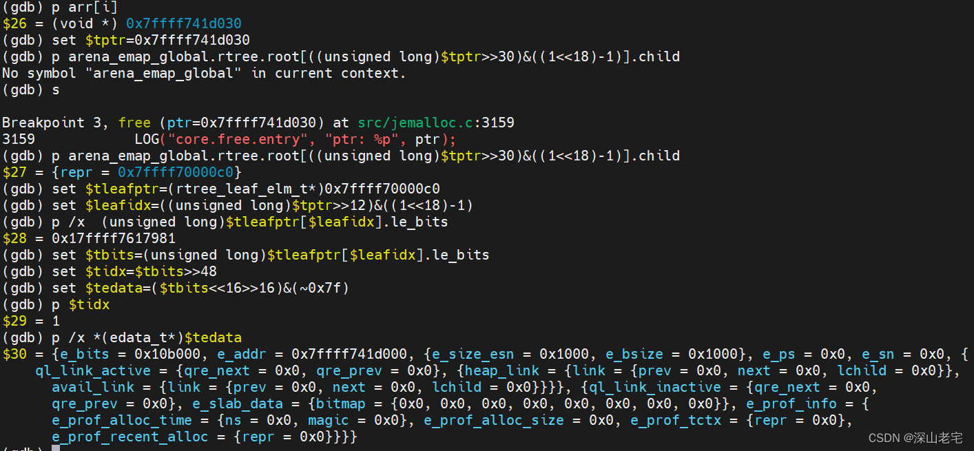 我们这个实例中前几次的free比较简单,并不需要把内存还到extent中(edata_t是用来描述extent的),因为这是small size class而且tcache.bin[1]依然有空间,故前几次的free只需要挪动tcache.bin[1].stack_head. 当tcache.bin[1]没空间时才需要flush 100个到extent(把stack_head下移,往高地址移动),此时才会用到extent信息。