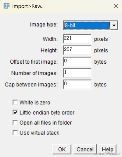 将BrainProtonDensitySliceBorder20.raw文件以ImageJ打开,配置如下: