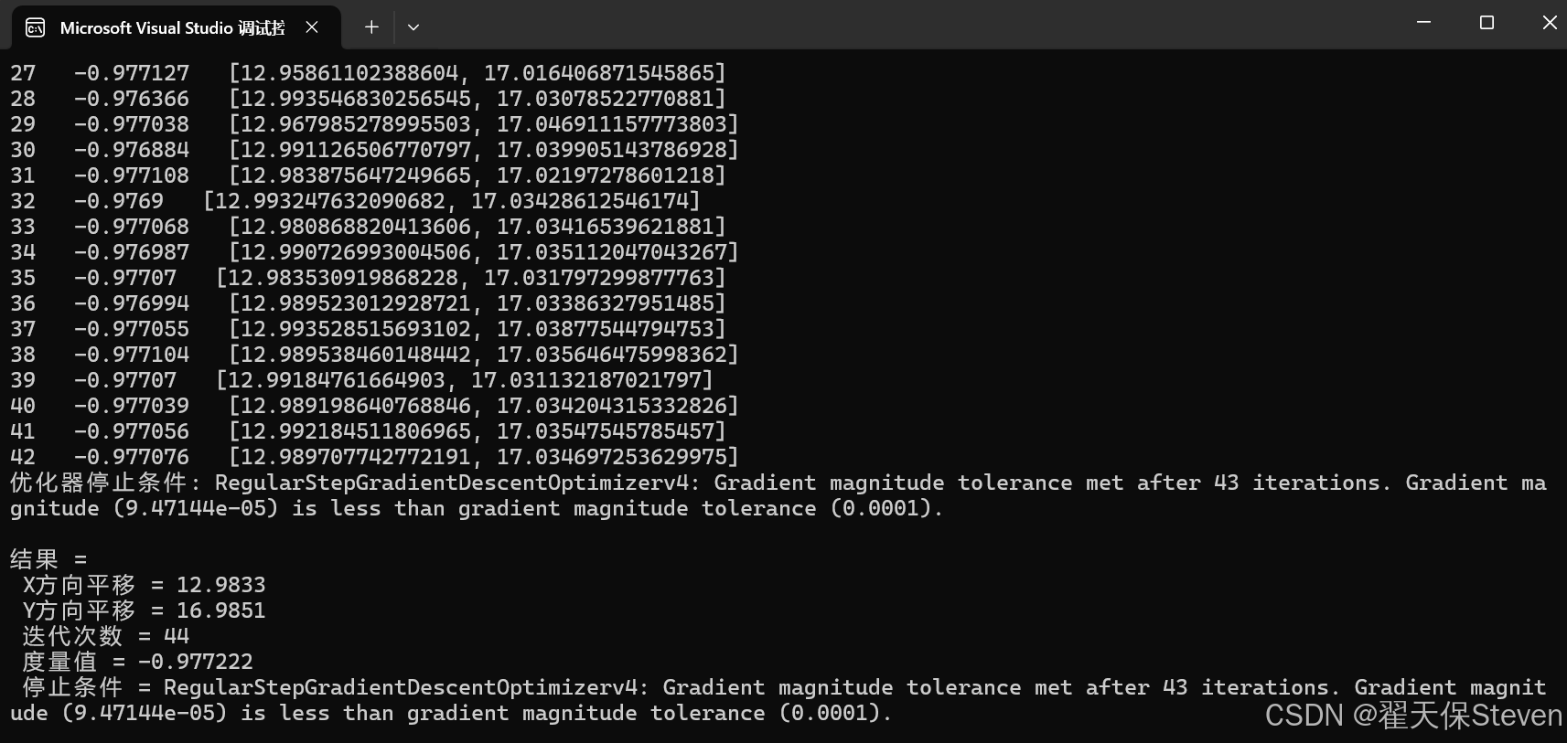 官方给定的浮动图像在 X 轴方向偏移了 13 像素,Y 轴方向偏移了 17 像素,理想情况下配准结果应该接近这两个值。在实际运行中,优化器会找到最优的变换参数,输出类似如下的结果: