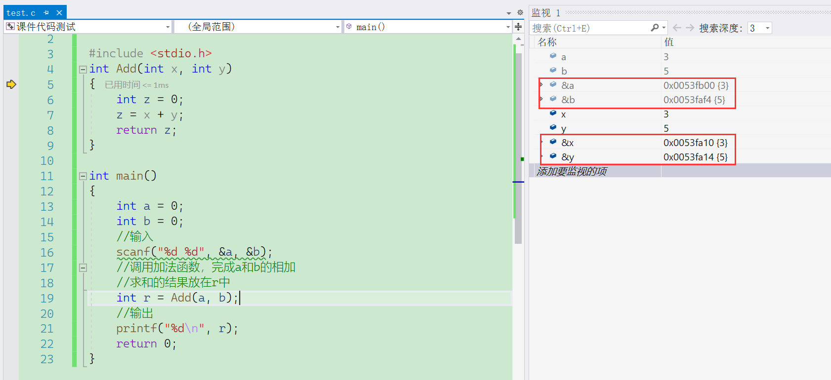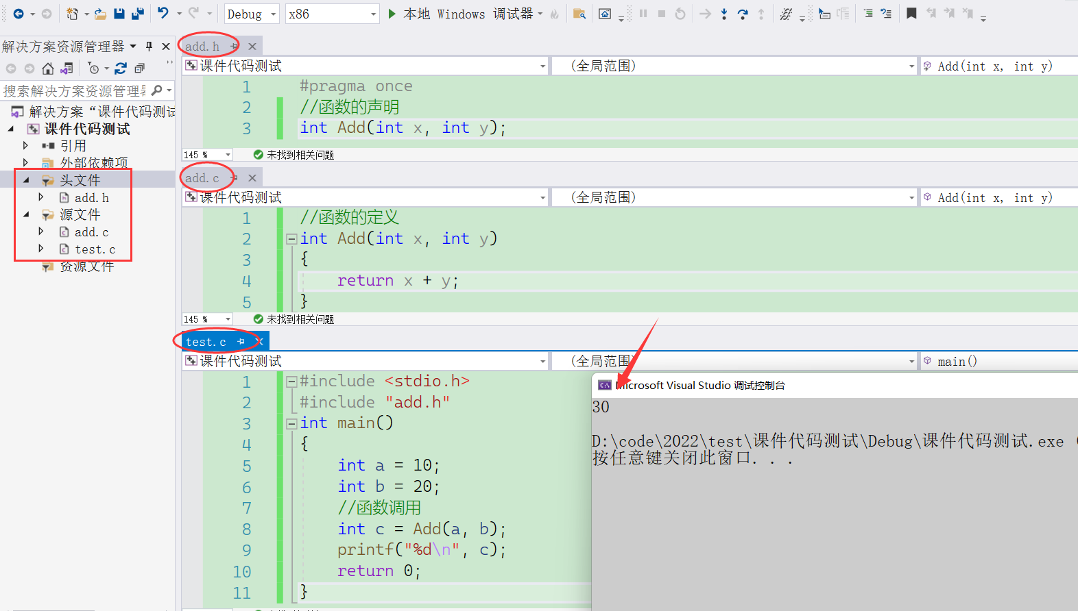 在上面代码中,第2~7行是Add 函数的定义,有了函数后,再第17行调用Add函数的。