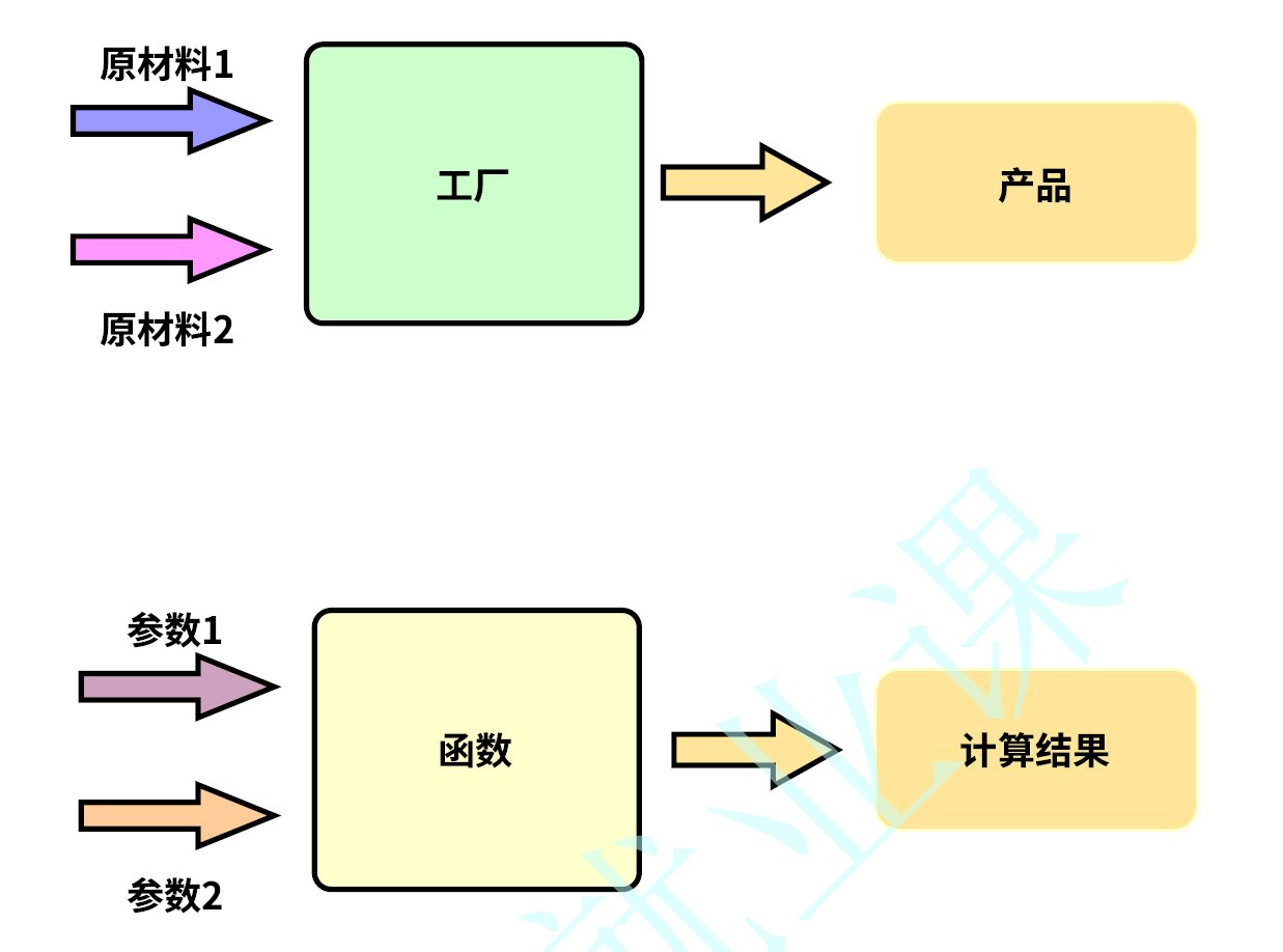 我们可以把函数想象成小型的一个加工厂,工厂得输入原材料,经过工厂加工才能生产出产品,那函数也是一样的,函数一般会输入一些值(可以是0个,也可以是多个),经过函数内的计算,得出结果。