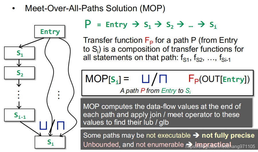 与我们之前使用的算法不同,我们以前使用的算法是在运行过程中沿着数据流反复迭代的,而MOP是找出从开头到结尾所有路径,分别进行传递函数计算,最后将算完的所有路径进行⊔/⊓,公式如下: