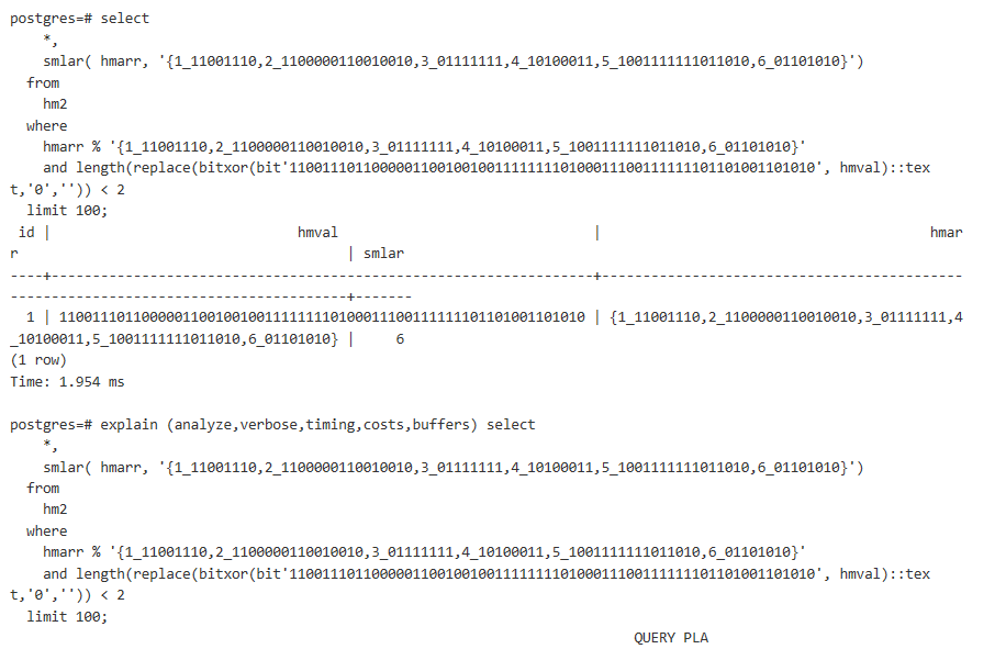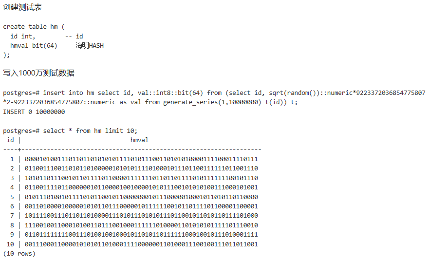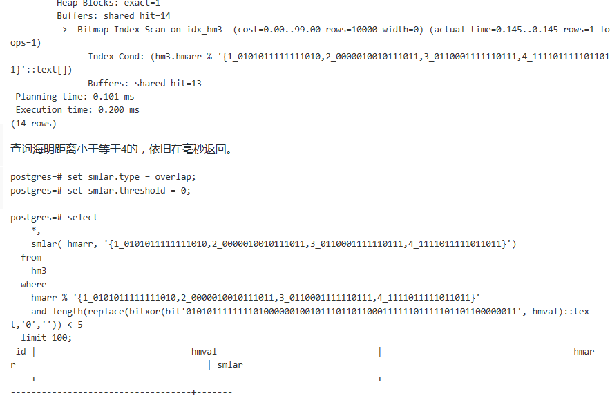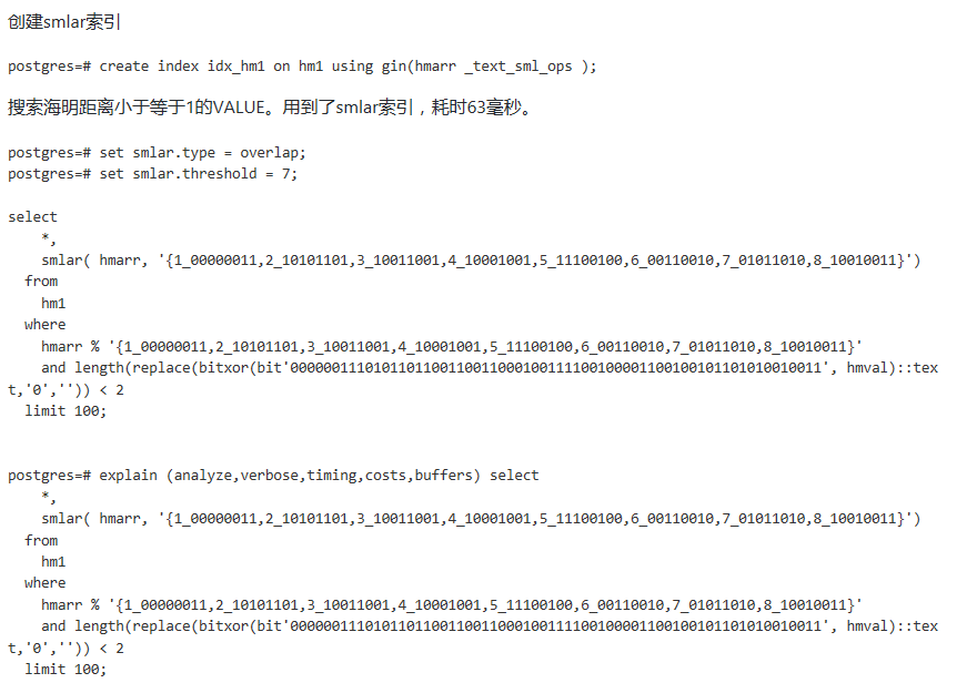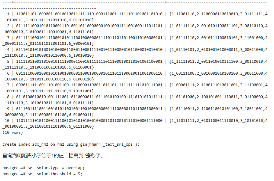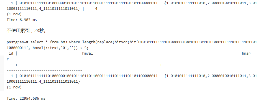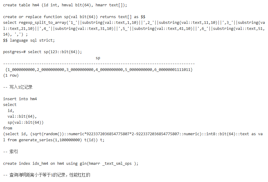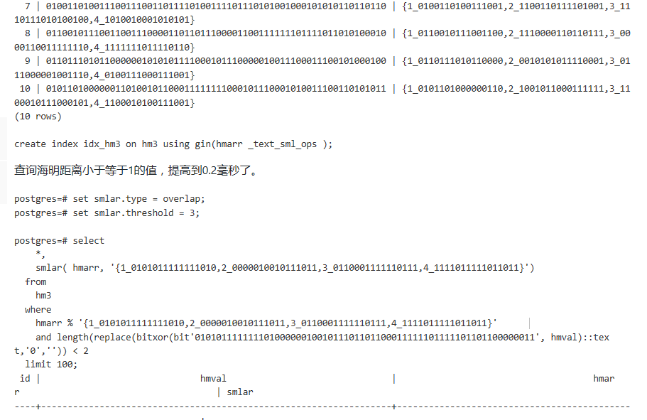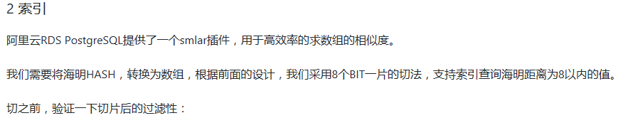 1、阿里云RDS PostgreSQL smlar插件,使用GIN索引,块级收敛,二重过滤。0.2毫秒的响应速度,1000万数据中,检索海明距离2以内的记录。