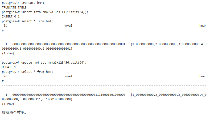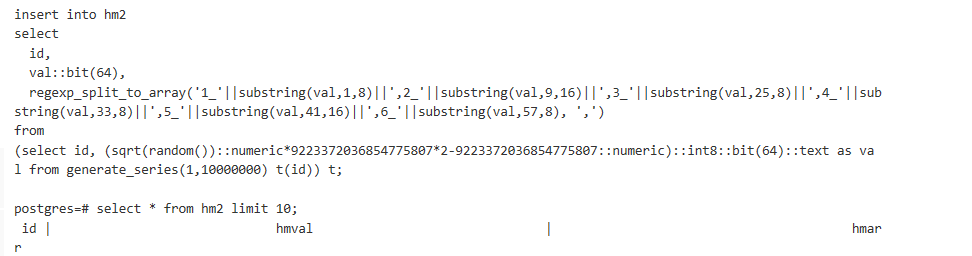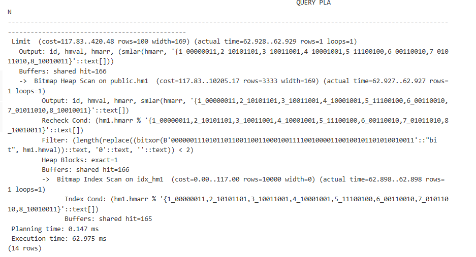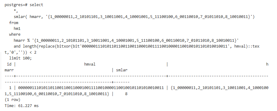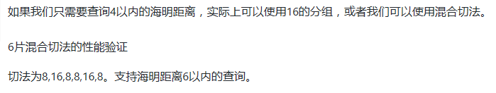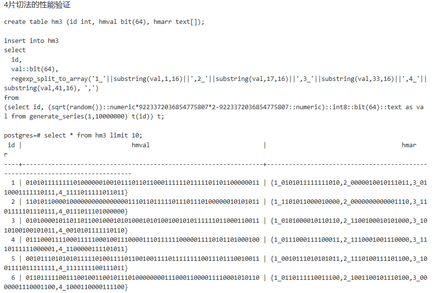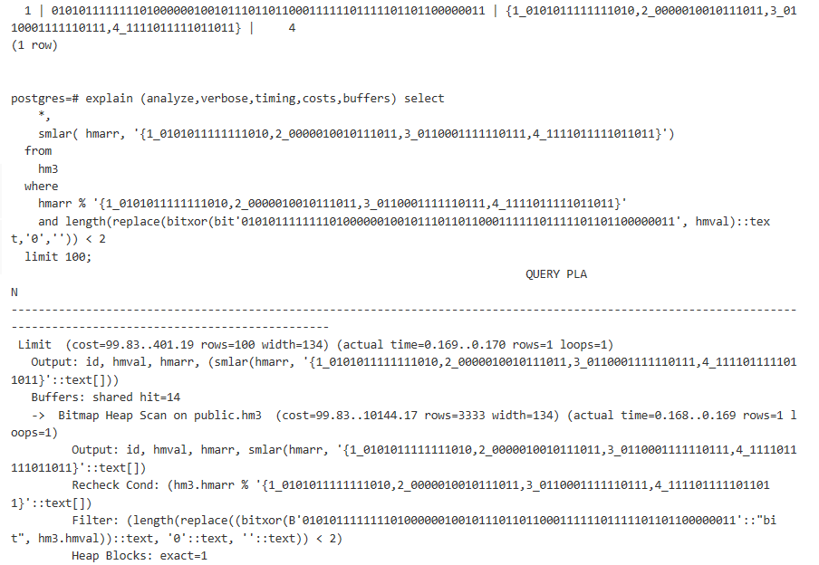 索引是高效的做法,例如PostgreSQL smlar插件,在阿里的导购平台就有使用,用于实时导购文的海量相似度查询。如果要让smlar加速海明距离的搜索,需要采用更科学的方法,比如切片。直接使用位置,会有问题,因为smlar的第一道工序是块级收敛,而海明码是bit64的编码,在一个数据块中,有若干条记录,任何位置都可能同时出现0和1,任何数据块都包含0和1,因此无法完成第一道过滤。我们可以采用切片,减少这种可能性。例如每2个BIT一片,或者每4个BIT一片,或者更多。通常海明距离大于3的,就没有什么相关性了。