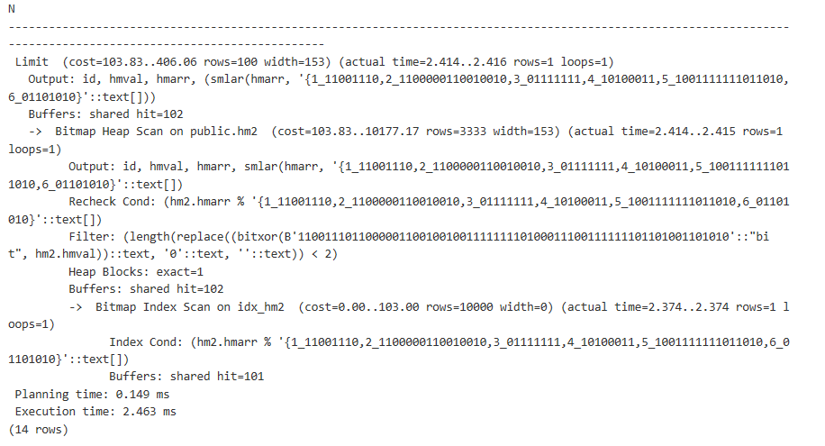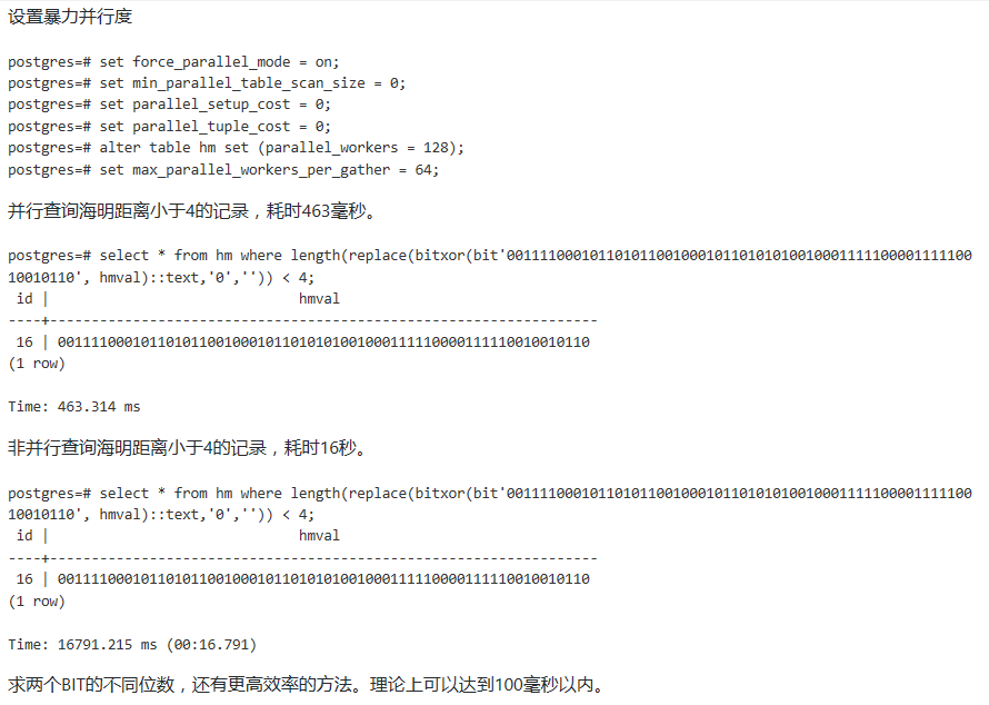 2、阿里云RDS PostgreSQL 10,使用多核并行,暴力扫描,1000万数据,检索海明距离为N以内的数据,约450毫秒。